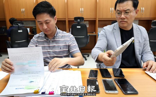 28일 손쉽게 대출을 해주겠다며 사회초년생들을 꼬드겨 대출금을 가로챈 13명을 붙잡아 조사 중이라고 밝힌 완산경찰서 경찰관들이 범행에 사용된 대출 서류를 검토하고 있다.