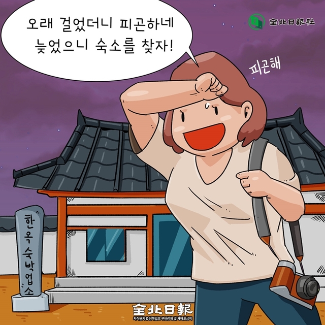 A양 “오래 걸었더니 피곤하네! 늦었으니 숙소를 찾자”