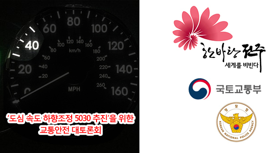 국토교통부와 경찰청, 전주시는 29일 전주시자원봉사센터에서 도심 내 차량제한속도를 30~50㎞/h로 하향조정하는 것을 골자로 한 ‘도심 속도 하향조정 5030 추진’을 위한 교통안전 대토론회를 열었다.