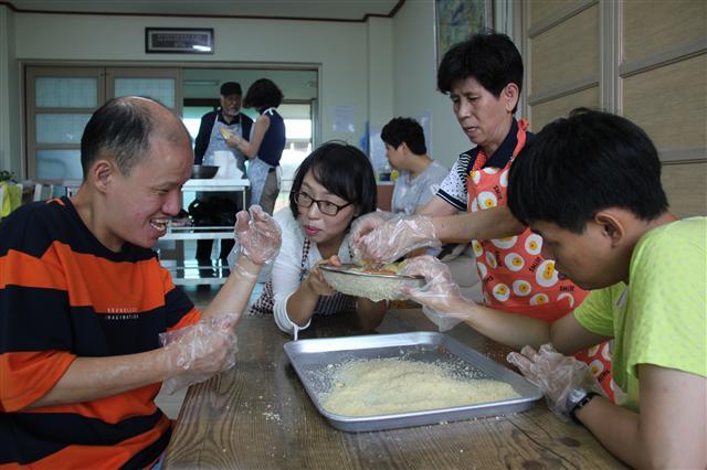 30-50대의 젊은 남녀 10명 정도가 두 테이블에 둘러 앉아 선생님의 주의사항을 들으며 경단을 빚고 있다. 찹쌀가루를 반죽하여 밤톨만한 크기로 동글동글하게 빚는다. 모두가 비닐장갑을 끼고 신기한 듯 경험해본다. 선생님은 반죽할 때는 더 힘주어 해야 한다고 몇 번 씩이나 강조한다. 노란 카스테라를 곱게 걸러내는 일도 해본다. 선생님은 함께 둘러 앉아 시범을 보이며 잘 할 수 있도록 한 명씩 한 명씩 요령을 일러준다. 몸 움직임이 좀 느린 듯 하면서도 시선은 반죽 행위에 집중하는 이들은 1, 2급의 지적장애인들이다.