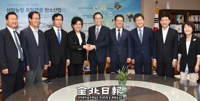 전북을 방문한 바른정당 이혜훈 대표와 최고위원회 등이 29일 오전 전북도청에서 송하진 도지사와 기념촬영을 하고 있다.