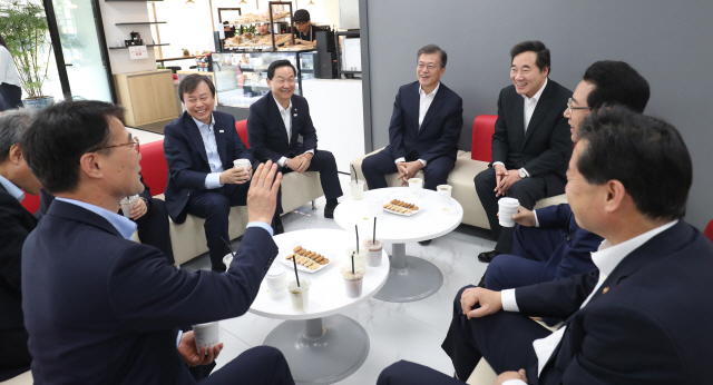 문재인 대통령이 30일 오후 세종특별자치시 정부세종청사에서 열린 '교육부·문화체육관광부 핵심정책 토의'에 앞서 열린 차담회에서 김상곤 부총리 겸 교육부 장관, 도종환 문화체육관광부 장관 등 4개 부처 장관들과 얘기를 나누고 있다. 연합뉴스
