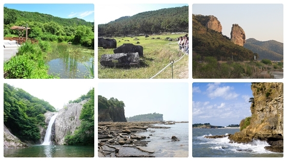 ▲ 운곡습지, 고인돌군, 병바위, 채석강, 적벽강, 직소폭포(왼쪽 위부터 시계방향으로)