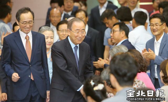4일 전북을 방문한 반기문 전 유엔 사무총장이 특강을 위해 도청 공연장에 들어서며 도민들과 악수하고 있다.
