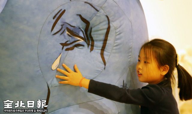 ▲ 전주세계소리축제 어린이 미술전시 아트프로젝트 미디어 체험전시가 실시된 5일 한국소리문화의전당 전시실에서 한 어린이가 대형 공기풍선으로 만든 코끼리 형상의 눈물을 어루만지고 있다. 박형민 기자