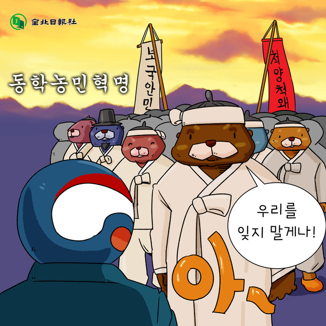 (동학농민군들이 자랑스럽게 바라보고 있다.)