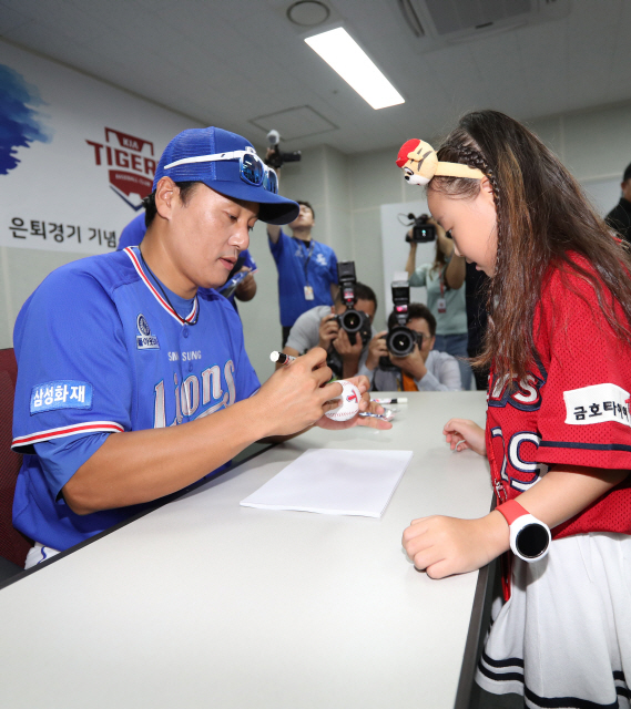 ▲ 삼성 라이온즈 이승엽이 10일 오후 광주 챔피언스필드에서 '은퇴투어' 팬 사인회를 하며 광주 어린이 팬들에게 사인을 해주고 있다. ·연합뉴스