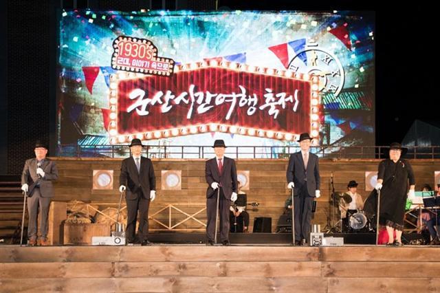 ▲ 지난 15일 군산시간여행축제 개막 행사에서 송하진 도지사·문동신 군산시장·박정희 군산시의장 등 각계각층 인사들이 1930년대 중절모를 쓰고 지팡이를 두드려 시간여행축제의 시작을 알리고 있다.