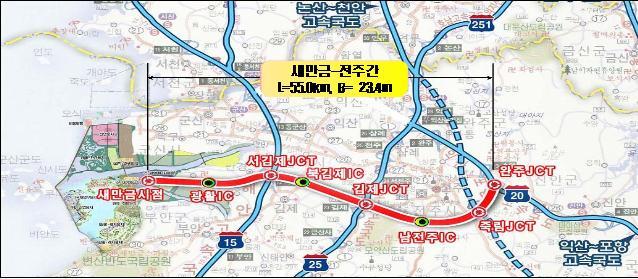 한편 새만금∼전주 고속도로는 새만금∼김제(26.64㎞), 김제∼전주(28.45㎞) 등을 잇는 총 연장 55.09㎞의 왕복 4차선 도로를 건설하는 사업이다.