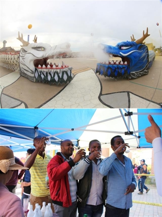 ▲ 벽골제 전설 '쌍룡놀이'(위)와 지난해 김제지평선축제를 찾은 외국인 관광객들이 한 체험부스에서 막걸리를 맛보고 있다.