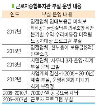 지난 2005년 개관한 이 시설은 당시부터 한노총이 위탁받아 운영했다. 이 곳은 초기부터 근로자보다는 일반인을 위한 운영, 근로자 복지보다는 수익사업으로 활용한다는 지적이 잇따랐다. 지난 2010년에는 공공요금 7000만원을 체납하는 등 공과금미납도 수시로 벌어졌다.