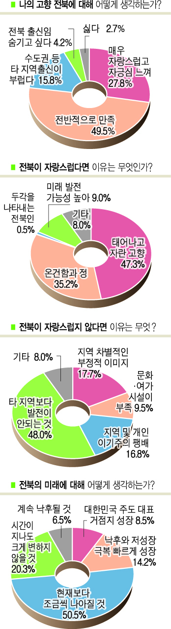 응답자 중 22.7%는 ‘고향 전북에 대해 어떻게 생각하는가’라는 질문에 부정적으로 답했다. 15.8%는 ‘수도권 등 타 지역출신이 부럽다’고 답했고, 4.2%는 ‘전북 출신임을 숨기고 싶다’고 응답했다. ‘싫다’는 응답자는 2.7%였다.