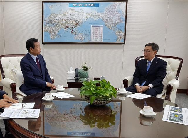 ▲ 지난달 27일 김생기 정읍시장(왼쪽)이 강영일 한국철도시설공단 이사장과 만나 KTX 정읍역 주변부지 활용을 건의했다.