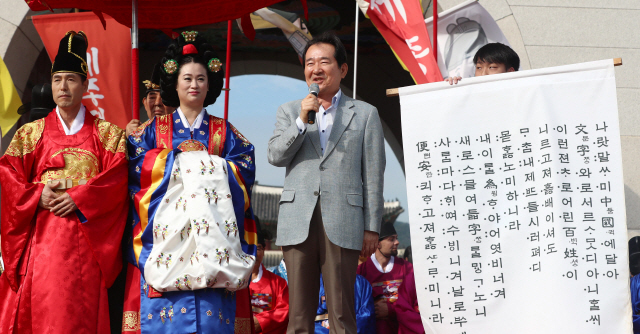 ▲ <한글날 기념식> 정세균 국회의장(왼쪽 세번째)이 한글날인 9일 서울 종로구 광화문 앞에서 열린 훈민정음 반포식 및 세종대왕 어가행렬 재현행사에서 인사말을 하고 있다. 연합뉴스