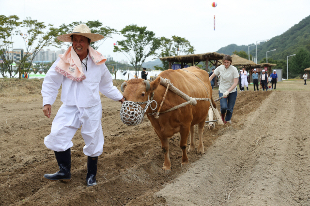 ▲ 횡성한우축제장에서 소 밭갈이 체험을 통해 옛 농경문화를 엿볼 수 있다.