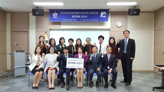JB금융그룹 전북은행(은행장 임용택)은 지난 12일 한국여성경제인협회 전북지회(회장 박영자)와 전주시 완산구 소재 여성기업종합지원센터 전북센터 2층 회의실에서 업무제휴를 위한 조인식을 가졌다고 15일 밝혔다.