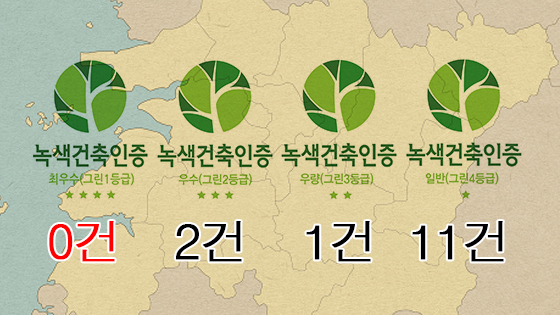 다만 전북에서는 우수등급(그린 2등급)을 받은 건물 2건, 우량등급(그린 3등급)을 받은 건물 1건, 일반등급(그린 4등급)을 받은 건물이 11건이었다.