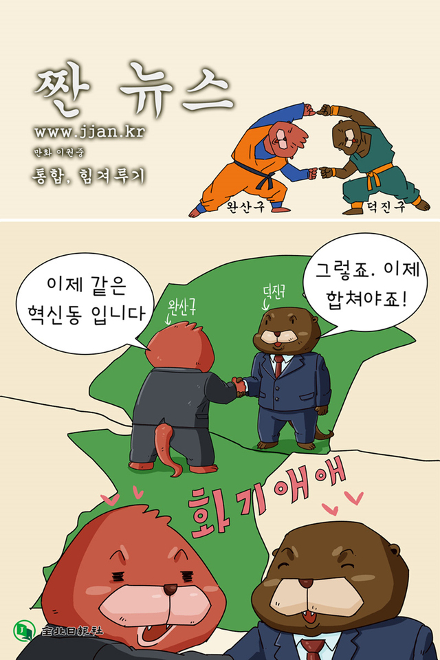(주민 투표 결과 덕진구로 통합되는 혁신동, 주민들이 환호하고 있다.)