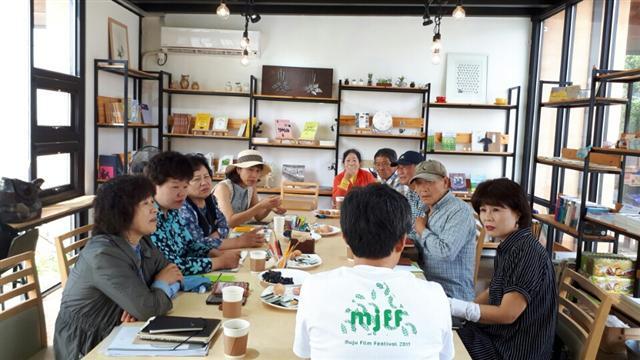 ▲ 자서전 쓰기 프로그램 참여자들이 현장학습의 일환으로 고창 책마을해리를 찾아 책에 대한 이야기를 나누고 있다.