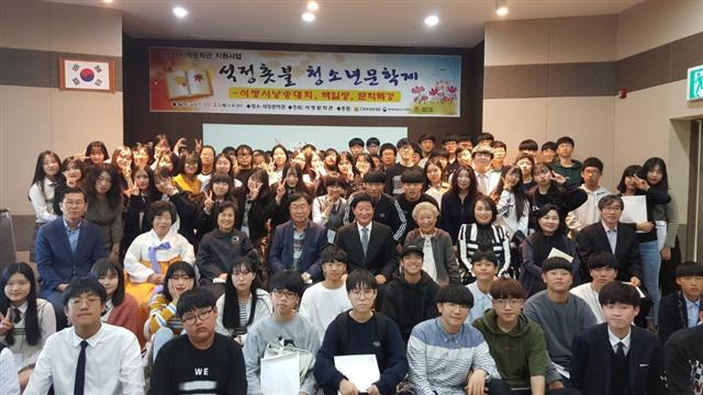 ▲ 지난 21일 석정문학관이 개최한 ‘석정촛불청소년문학제’에서 부안지역 중·고등학생들이 참가해 기량을 펼치고 기념사진을 찍고 있다.