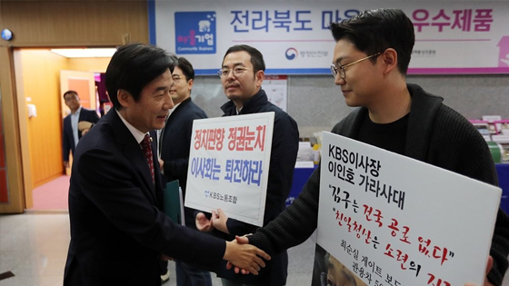 ◇…국감장 입구를 에워 싼 KBS 전주방송노조와 전북도청 청사를 에워 싼 전주MBC 노조원들은 “경영진과 이사진은 사퇴하라. 김장겸과 고대영은 퇴진하라”고 외치며 장기간 지속되고 있는 방송사들의 파업 투쟁에 대한 국회의 관심과 해결 노력을 촉구했다.