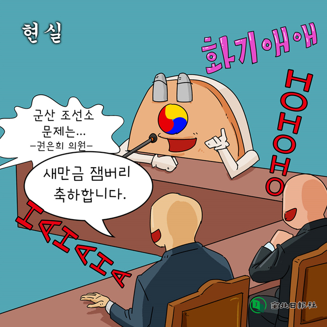 (하지만 현실은 현안이 빠진 칭찬 일색. 권은희 의원만 군산 조선소 문제를 이야기하지만 묻혀버린다.)