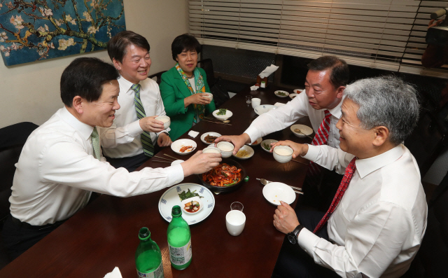 ▲ “우리당 문제 없어요” 국민의당 안철수 대표가 24일 저녁 서울 여의도의 한 식당에서 김동철 원내대표 등 당 중진의원들과 만찬을 하며 건배하고 있다. ·연합뉴스