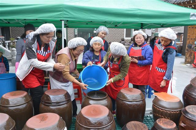 ▲ 지난 3일부터 4일까지 시흥시 급식관리센터 관계자 80여명이 순창 전통장 농촌문화학교에서 장담기 체험을 하고 있다.