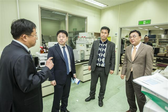 ▲ 지난 3일 전북생물산업진흥원을 찾은 황태규 청와대 균형발전비서관이 생진원 입주기업을 방문해 특화정책에 대해 설명을 듣고 있다.