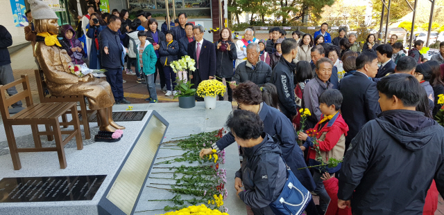 ▲ 지난 4일 진안군청소년수련관 입구 인근에 세워진 ‘평화의 소녀상’앞에서 군민·청소년들이 헌화를 하고 있다.