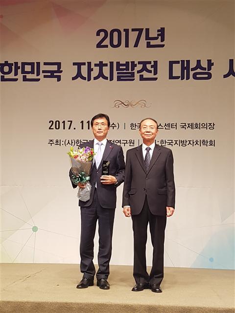 ‘대한민국 자치발전 대상’은 지방자치시대 22주년을 맞아 지역의 특색 있는 독창적 행정으로 지역발전과 지역혁신에 모범이 되는 성과를 보여준 국회의원, 광역 및 기초자치단체장, 광역의원 등에게 수여하는 상으로, 올해 처음 만들어졌다.