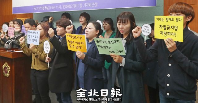 전북공동행동은 “지난 2007년 법무부가 입법 예고한 차별금지법안이 제정되지 못하고 철회 사태까지 벌어지는 사이 차별금지법을 왜곡하고 반대하는 세력은 혐오와 차별을 노골화하고 있다”며 “혐오와 차별 세력은 법 제정을 좌초시키려는 것에 그치지 않고 혐오와 차별을 확산하고 있고 인권 관련 법 제도를 공격하는가 하면, 자치단체의 인권조례 폐지마저 요구하고 있다”고 주장했다.