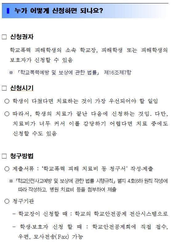 ‘학교폭력 선 치료비 지원 후 구상 제도’는 학교폭력 피해사실이 확인되고 진단서 등 치료사실 입증자료 등을 학교안전공제회에 제출하면, 공제회는 피해 학생에게 치료비를 먼저 지급하고 가해 학생 부모에게 치료비 구상권을 청구하는 제도다.
