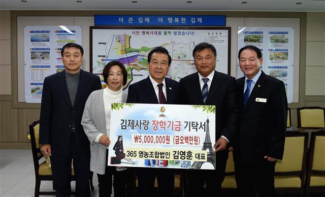 ▲ 김제시365영농조합법인 김영훈 대표가 13일 김제사랑장학재단에 장학금 500만원을 기탁하고 시 관계자들과 기념촬영을 하고 있다.
