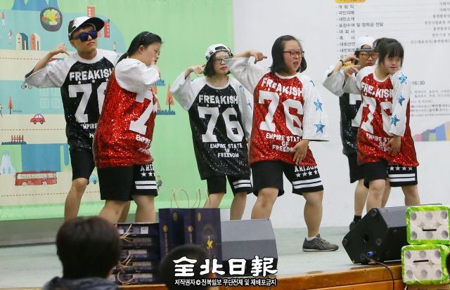 제18회 전주시 장애인 한마음 문화행사가 열린 13일 전주시청 강당에서 한 장애인 단체 참가자들이 신나는 노래에 맞춰 율동을 선보이고 있다.