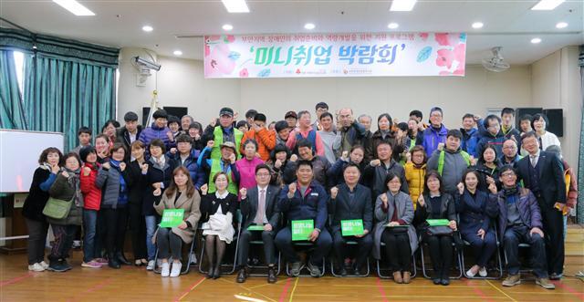 ▲ 20일 부안복지관 강당에서 장애청소년 및 취업희망 장애인 100여명을 대상으로 열린 미니취업박람회에서 참석자들이 파이팅을 외치고 있다.
