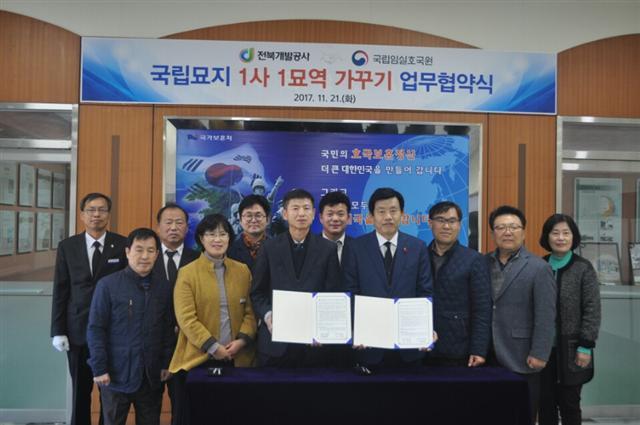 전북개발공사(사장 고재찬)는 21일 도내 기관단체중 최초로 국립임실호국원(원장 박종덕)과 ‘국립묘지 1사1묘역 가꾸기’ 업무협약을 체결했다.