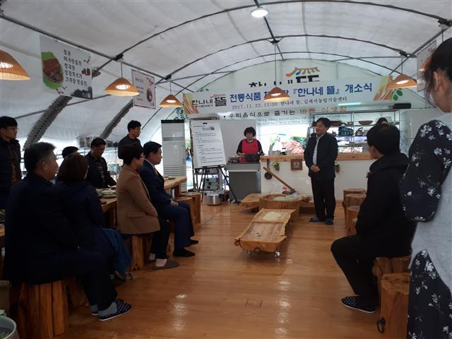 전통음식 체험관인 ‘한나네 뜰(대표 한영분)’은 22일 금구면 월전1길 한나네 뜰 사업장에서 유춘기 김제시농업기술센터 소장 및 온주현 시의원, 김제시전통장류연구회원, 유관기관 관계자, 마을주민 등 50여명이 참석한 가운데 개소식을 갖고, 그동안 사업추진 경과보고 및 인절미 떡메치기 체험, 우리음식 맛 체험 등을 실시했다.