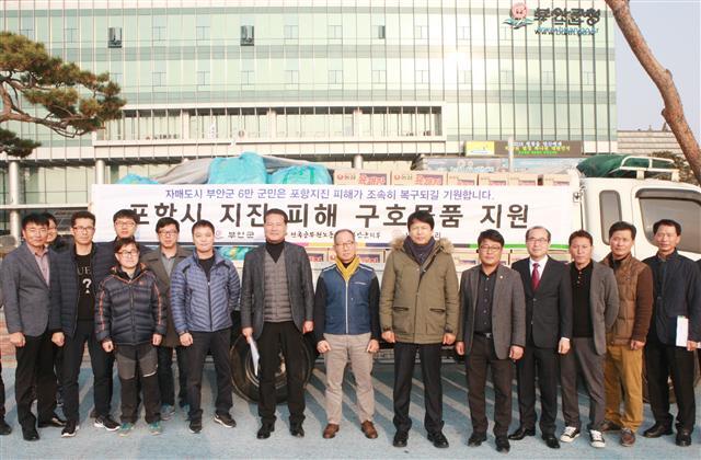 부안군은 29일 자매도시이자 지진피해를 입어 어려움을 겪고 있는 경북 포항시를 찾아 1000만원 상당의 구호물품을 전달하고 지진피해의 아픔을 함께 나눴다.