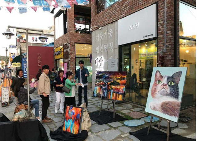▲ 전주 동문예술거리를 바꾸고 있는 청년들의 활동 모습. 매달 한 번씩 예술장터가 열린다. (촬영=주종구 동문예술장터 자원봉사자)