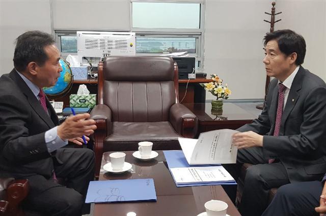 ▲ 황숙주 순창군수가 국회를 방문해 이용호 의원에게 금과 방축 입체교차로 설치사업비 예산 반영을 위한 협조를 구하고 있다.