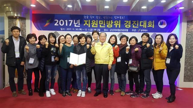 ▲ 김제시 여성지원민방위대가 지난 달 30일 전북도 주관으로 군산에서 열린 전라북도 지원민방위경진대회에서 최우수상을 수상하고 기념사진을 찍고 있다.