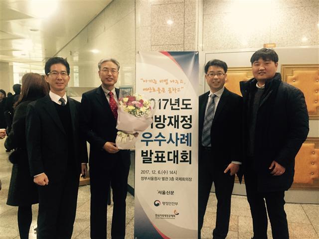 ▲ 남원시 관계자들이 행정안전부와 서울신문이 공동개최한 ‘2017년 지방재정(예산효율화) 우수사례 발표대회’에서 우수자치단체로 선정돼 기념촬영을 하고 있다.