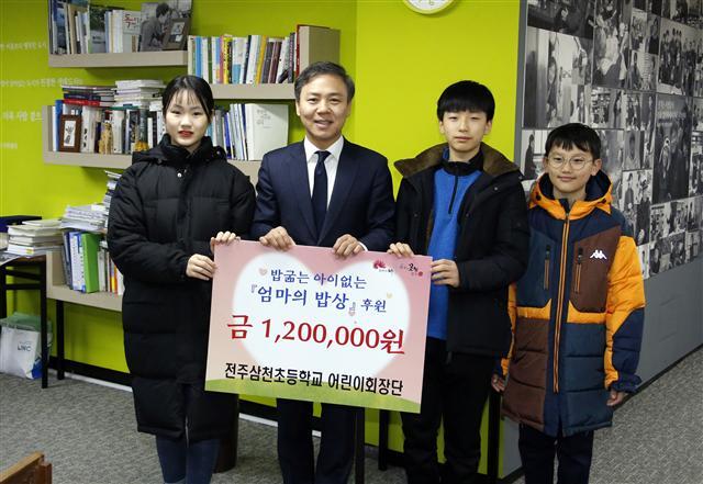 전주 삼천초등학교 어린이회장단은 12일 오전 전주시장실을 방문, ‘엄마의 밥상’사업에 써달라며 120만원을 전달했다.
