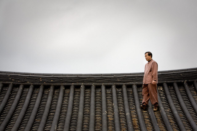 ▲ 한옥 지붕에 올라가 있는 이근복 번와장.