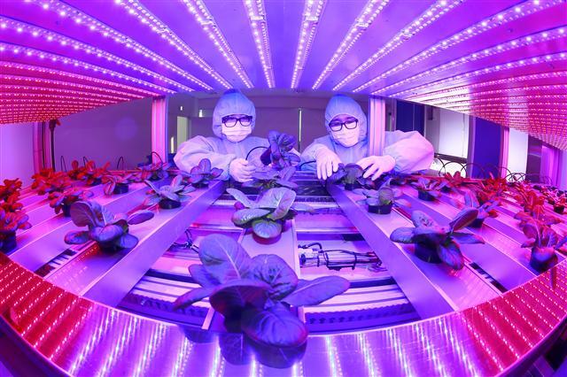 ▲ 농진청 관계자들이 식물공장에서 자라는 작물의 상태를 살펴보고 있다.
