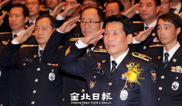 ▲ 강인철 신임 전북경찰청장이 13일 전북경찰청에서 열린 취임식에서 국민의례를 하고 있다.