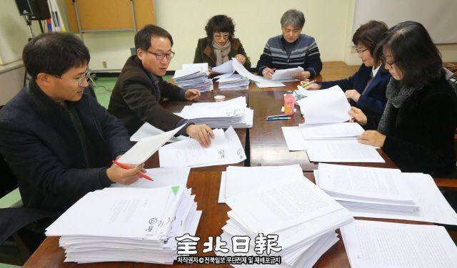 지난 14일 오후 전북일보사 회의실에서 ‘2018 전북일보 신춘문예’ 예비심사가 열렸다. 심사는 ‘전북일보 문우회(신춘문예 당선자 출신 작가들의 모임)’의 박태건 시인, 문신 문학박사, 장은영 동화작가, 김형미 시인, 정숙인 소설가, 최기우 극작가가 참여했다.