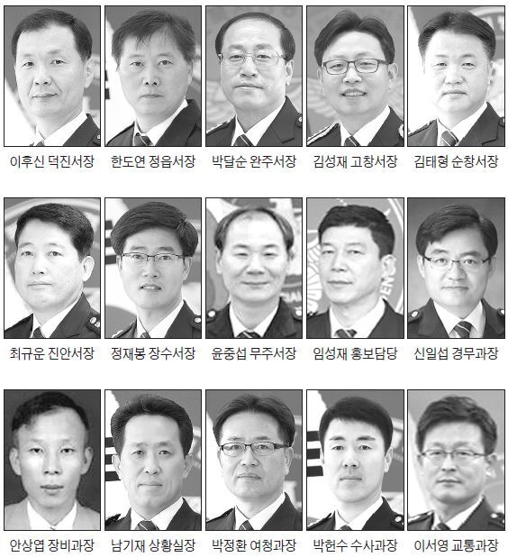 이번 인사에서 덕진서장에 이후신 전북청 수사과장, 정읍서장에 한도연 정보화장비과장, 완주서장에 박달순 홍보담당관, 고창서장에 김성재 경비교통과장, 순창서장에 김태형 여성청소년과장, 진안서장에 최규운 광주청 112종합상황실장, 장수서장에 정재봉 경무과장, 무주서장에 윤중섭 광주청 보안과장이 각각 임명됐다.