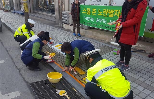 부안경찰서(서장 이동민)는 스쿨존 교통사고 제로화 추진을 위하여 초등학교 앞 횡단보도에 녹색어머니회 회원들과 노란발자국을 그리는 행사를 실시했다.